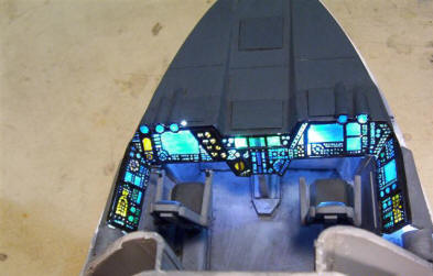 Being the production designer, Hawk was able to make sure the sets and miniatures accurately matched up. The Aurora miniature was rigged with working engine lights as well as spring-loaded landing gear, running and landing lights, air lines running to the vertical thrusters, and a detailed cockpit with illuminated control panels.