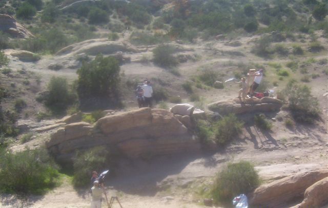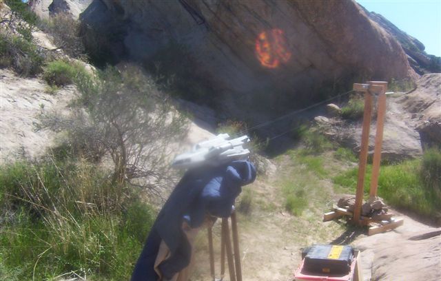 For cost and convenience, Hawk chose to do as many effects in camera as possible. For the crash and take off sequences, this meant traveling on location to Vasquez Rocks with the main unit. There Hawk assembled a compact wire rig that he had custom designed. The rig consisted of wires strung between two 6 foot tall towers that “flew” the Aurora miniature over a span of up to 40 feet. This enabled Hawk and his crew to get dynamic shots.